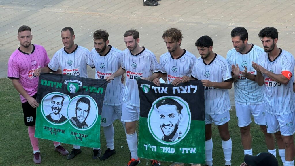 שחקני מ.כ כפר סבא1928, מקדישים את הניצחון לזכרם של אוהדי הקבוצה. צילום: דוברות מ.כ כפר סבא1928